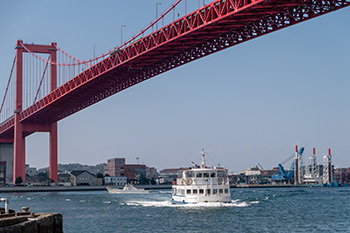 洞海湾に架かる深紅の若戸大橋と、日差しを浴びて海を渡る渡船は区民の故郷の風景です。